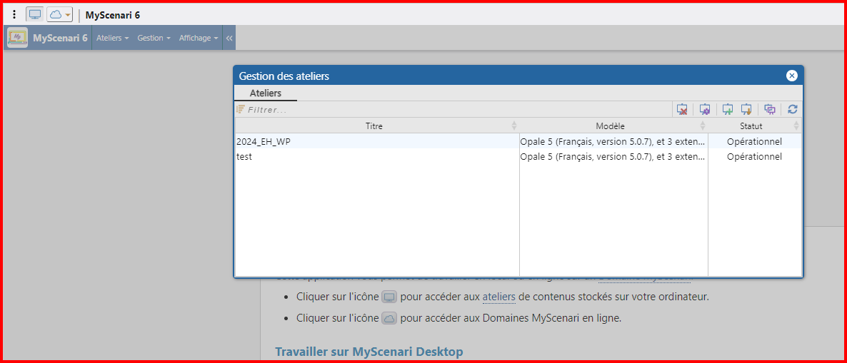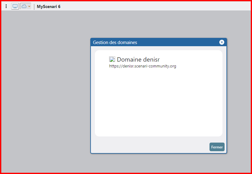 Pour accéder à l’environnement serveur ou « cloud » de MyScenari, il faut sélectionner le bouton avec l’icône du nuage (en haut à gauche de l’écran) et vous connecter. Vous retrouverez alors toutes les fonctions collaboratives.