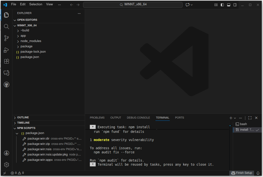 Une fois l’installation des prérequis effectués vous pouvez alors lancer l’un des choix de packaging pour Windows (dir, zip, nsis ou appx). Pour un exe d’installation traditionnel choisir nsis.
