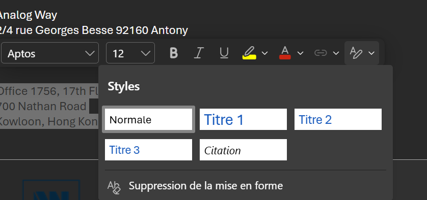 je cherche a contrôler la mise en forme d’un texte de bloc d’adresse, et le « copy paste », même nettoyé avec la « suppression de mise en forme », et « Paste Plain text » ou « Past single paragraphe Plain text » n’est pas très flexible.