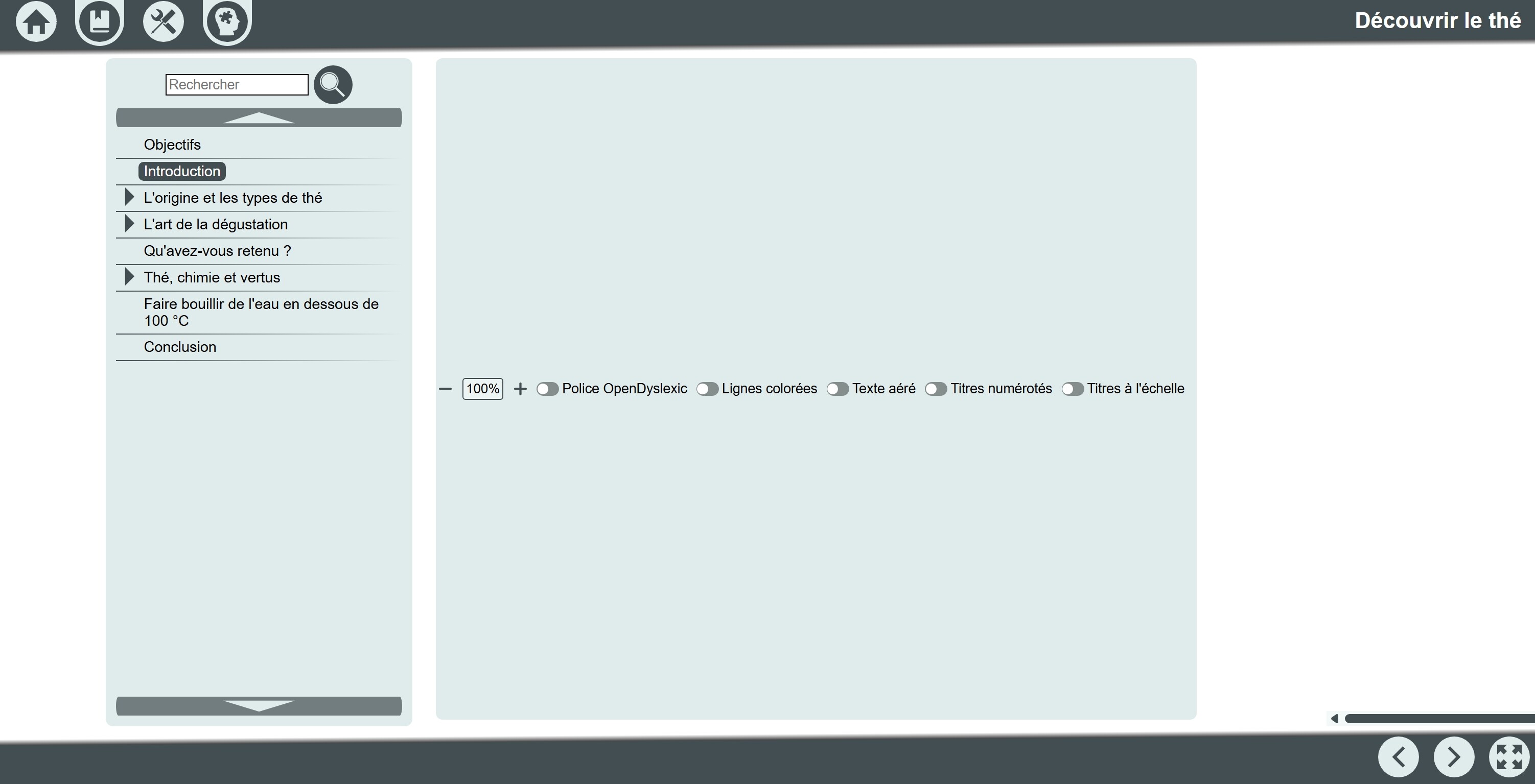 En activant la « Barre d’outil accessibilité » dans les paramètres de publication dans un modèle Opale 25 et en générant du contenu (en web et en scorm 1.2) avec l’habillage Aurora (Skinpack Aurora version 25.2 & Opale 25 Version (25.1.1)).