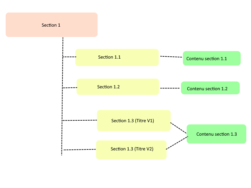 Mon cas est finalement un peu différent. En gros, seul le titre et l’entête de la section change, mais le contenu ensuite voire les sous-sections sont les mêmes. J’ai essayé de faire un petit schema :