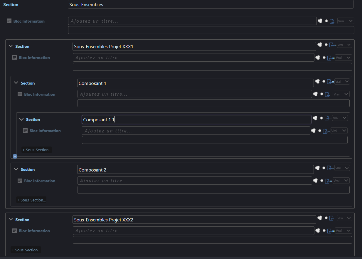 Donc ici Sous-Ensembles projet XXX1 est une section virtuelle qui n’a pour but que de conditionner l’existence de Composant 1 et Composant 2 dans le guide ?