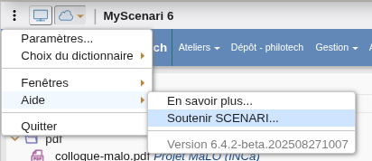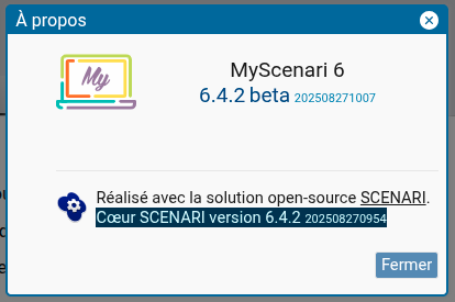 On pourrait aussi associer au numéro de version (non copiable dans ce menu) cette info à nouveau (pour enlever toute ambiguïté) : il y a juste écrit “Version 6.4.3-beta.202510081536” mais on ne sait pas de quoi. Donc “Client MyScenari Version 6.4.3-beta.202510081536”
