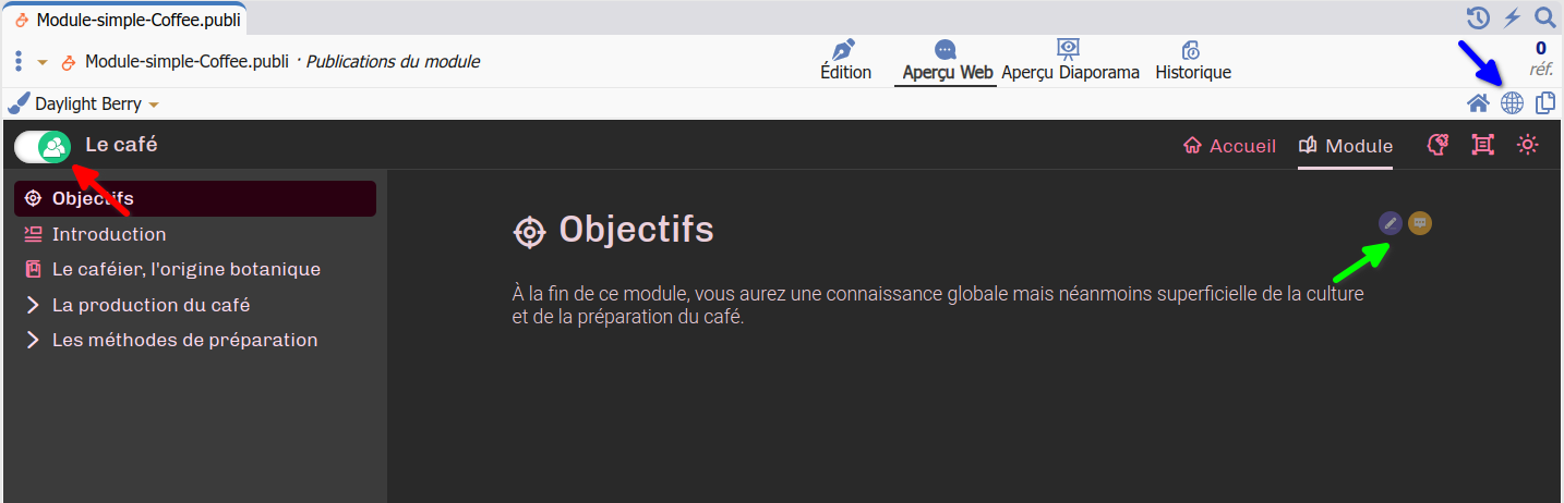 Si le besoin est de gérer la relecture, quand on est en mode serveur, l’aperçu web permet d’éditer ou commenter le contenu directement sur la publication web.