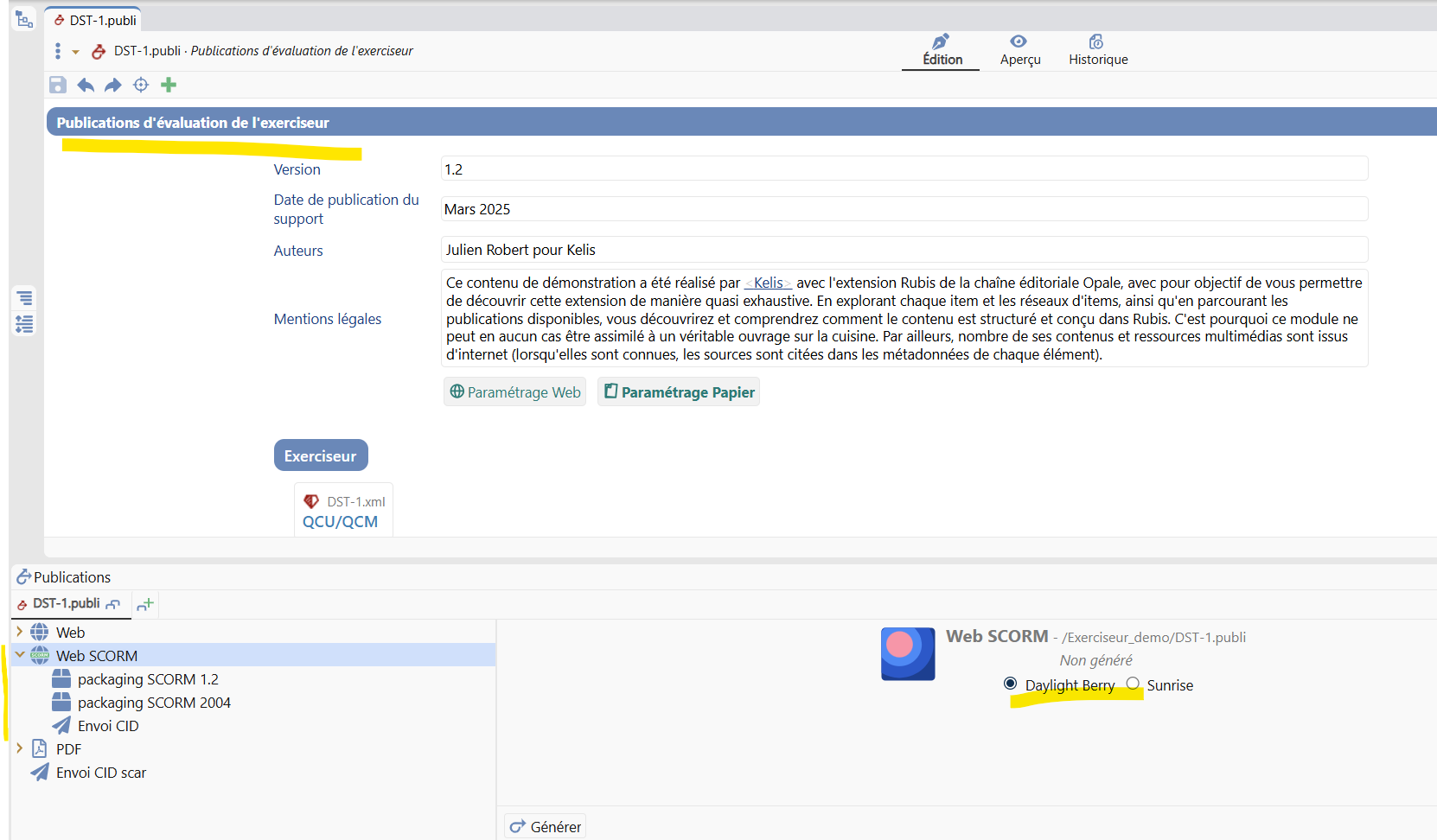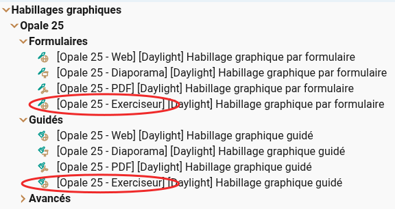 Pour l’habillage graphique, il est possible de le choisir au niveau de la publication, mais il faut qu’il soit installé au préalable (menu Gestion > Habillages graphiques des modèles > choisir un habillage graphique incluant la version pour l’exerciseur).