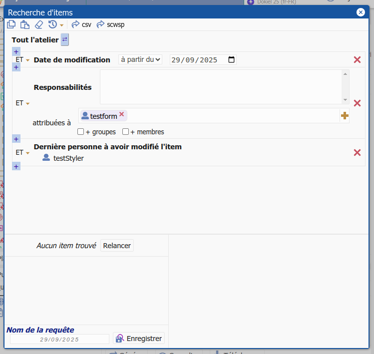 Une fois dedans tu peux combiner différents critères de recherche dont la date de modification et/ou la « responsabilité » et/ou la dernière personne a avoir modifié l’item.