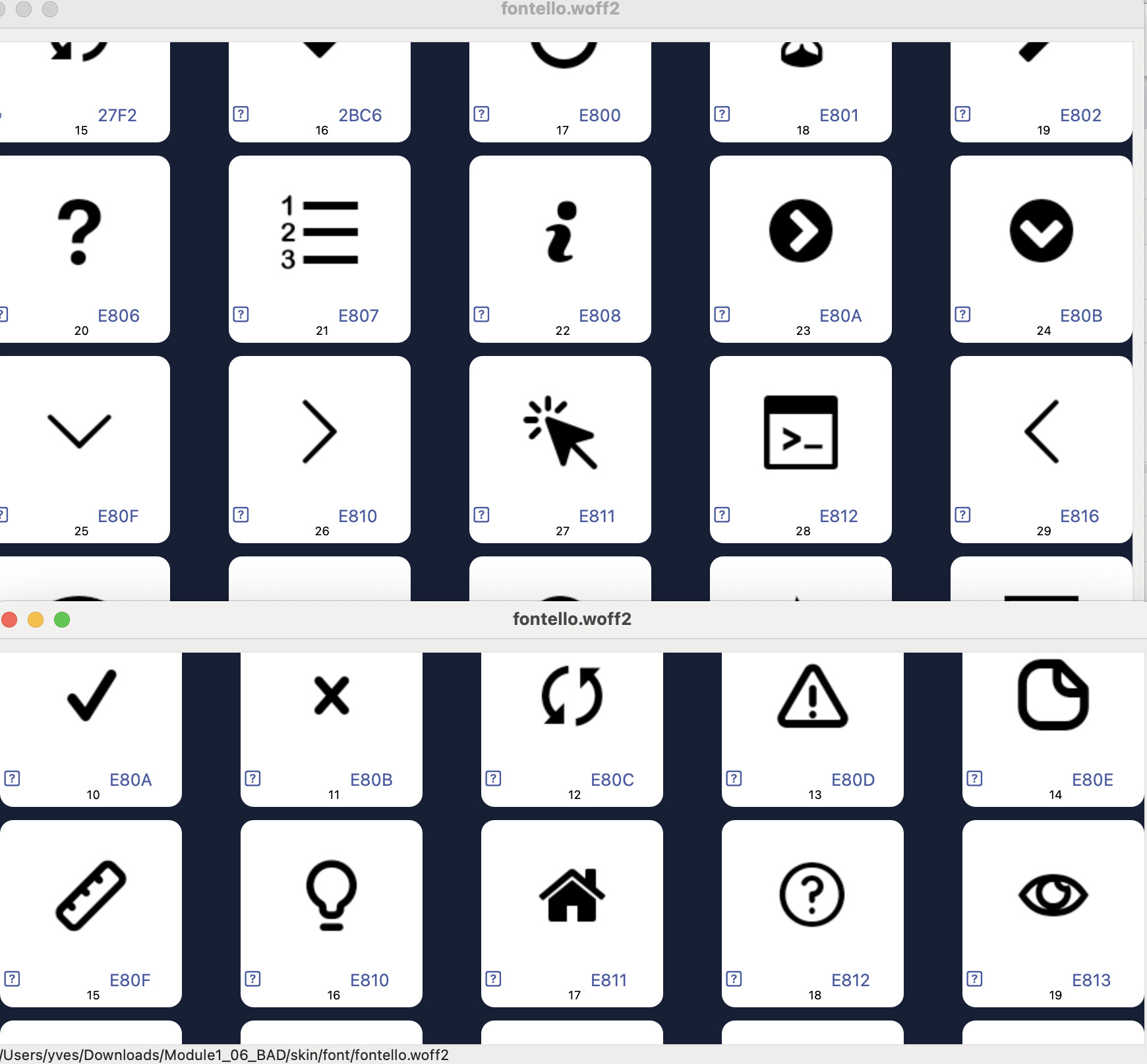 Si tu veux remettre une icône à la ligne de commande il faut modifier fontello.woff2 sur le site fontello en ajoutant ton choix d’icône. Voici un tuto.